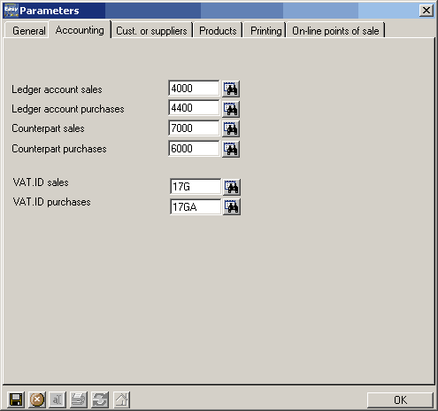 The COUNTERPART and Ledger account (general accounts sales and purchases in accountancy) can be encoded and can be used for a possible connection of "Easy For You" to accountancy software.