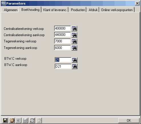 De CENTRALISATIEREK (rekening generaal verkoop en aankoop in de boekhouding) kan eventueel ingegeven worden en kan dienen voor een link van Easy For You naar een boekhoudingprogramma.